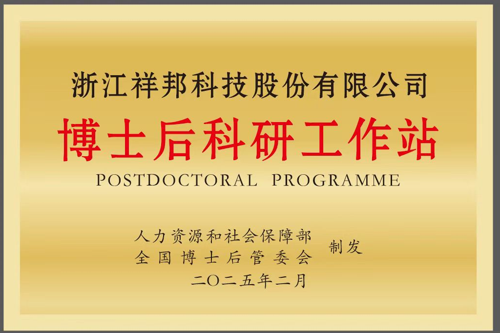 2025年2月經(jīng)國家人社部、全國博士后管理委員會聯(lián)合批準(zhǔn),祥邦科技正式設(shè)立國家級博士后科研工作站。這一里程碑距2023年3月建成浙江省博士后工作站僅兩年,標(biāo)志著公司在產(chǎn)學(xué)研融合與核心技術(shù)攻堅領(lǐng)域邁入新階段,為深化科研創(chuàng)新體系、打造高端人才高地筑牢了根基。
